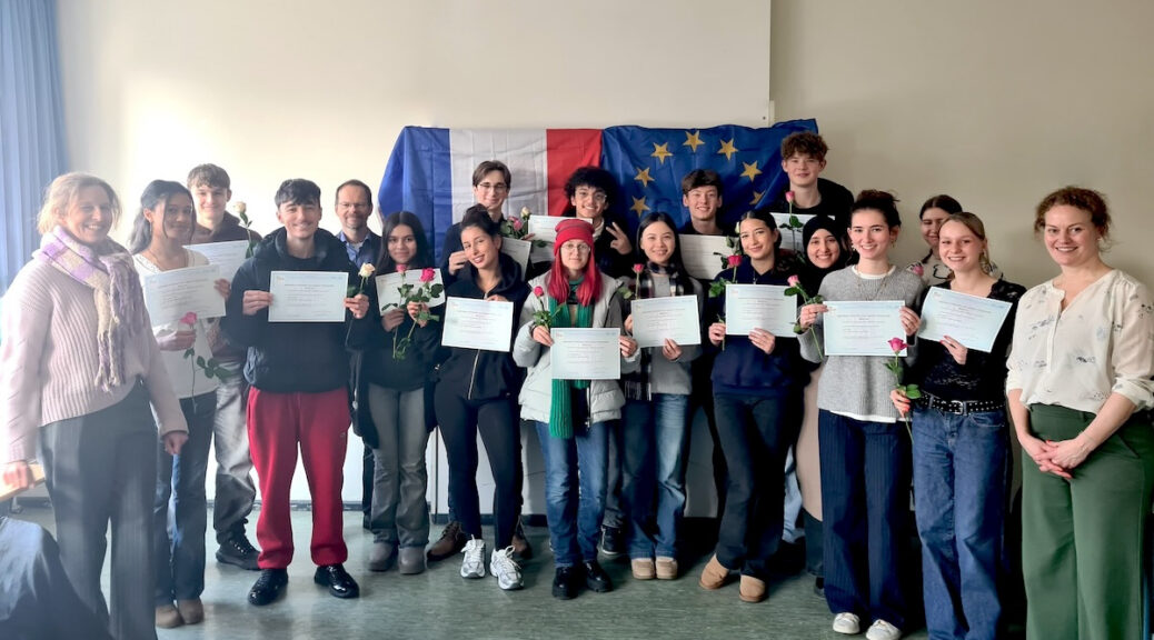 18 Schüler:innen des 11. Jahrgangs können sich über bestandene DELF-Prüfungen freuen. Bereits im 10. Jahrgang waren sie von den Französischlehrkräften Frau Margedant und Frau Lemaire im regulären Fremdsprachenunterricht auf die Prüfungen vorbereitet worden. Nun erhielten sie ihre Urkunden, die ihnen Französischkompetenzen auf dem Niveau B1 attestieren.