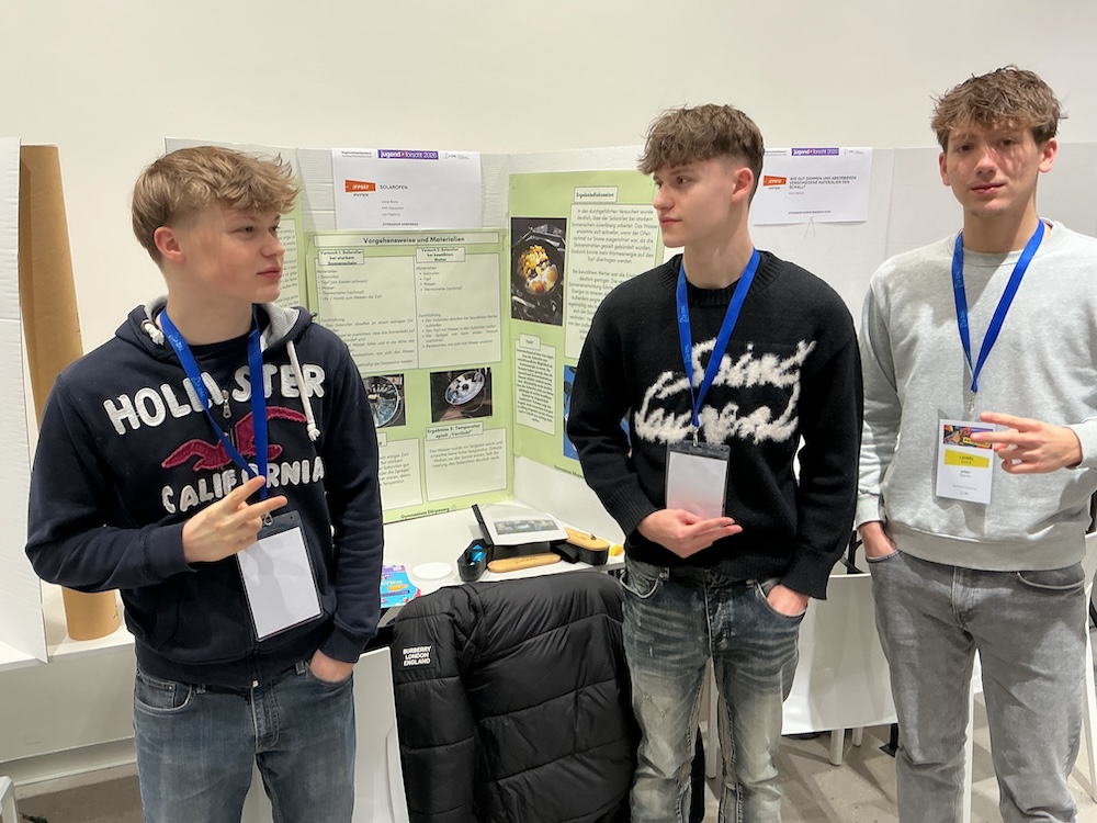 Die Schule verfügt über einen großen Hohlspiegel, und der wurde endlich wieder einmal verwendet, als Lionel Bothe, Kimi Clausnitzer und Leo Topalovic probierten, damit Wasser zu erwärmen. Bis zum Kochen hat es der Solar-Ofen noch nicht geschafft, waren die Wetterbedingungen doch bisher auch suboptimal, aber einen Besuch im Planetarium als Sonderpreis wurde auch diesem Projekt aus dem Fachgebiet Physik bereits zugesprochen.