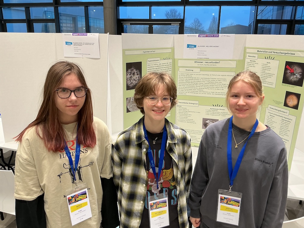 Marthe Dannemann, Marta Jezynska und Katharina Hanemann (10b) möchten wissen, ob Glimmer in Kosmetik unter umweltfreundlicheren und moralisch vertretbareren Bedingungen neu hergestellt oder ersetzt werden kann – eine neuartige Forschungsidee, die von der Jury ebenfalls sehr gelobt und mit einem Sonderpreis (Umwelt) ausgezeichnet wurde. Für ihr im Fachgebiet Chemie angesiedeltes Projekt beschäftigten sich die drei Nachwuchsforscherinnen zunächst mit den Eigenschaften von natürlichem und synthetischem Glimmer sowie mit Perlmutt als möglicher Alternative. Anschließend führten sie eigene Versuche durch, um schimmernde Effekte mithilfe anderer Stoffe zu erzeugen.