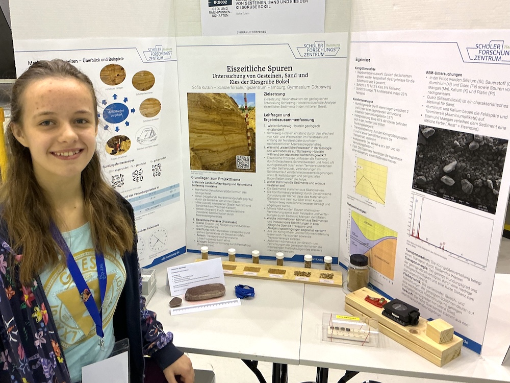 Einen weiteren 1. Platz erreichte Sonja Kutsin (8b) mit ihrer Untersuchung von Gesteinen, Sand und Kies der Kiesgrube Bokel. Dafür nahm Sonja Proben von Sedimentschichten an einer 2m hohen Sedimentwand und analysierte diese anschließend im Labor. Auf diese Weise konnte sie eiszeitliche Prozesse, denen die Mineralien ausgesetzt waren, nachzuvollziehen und für heutige Betrachter sichtbar machen.
