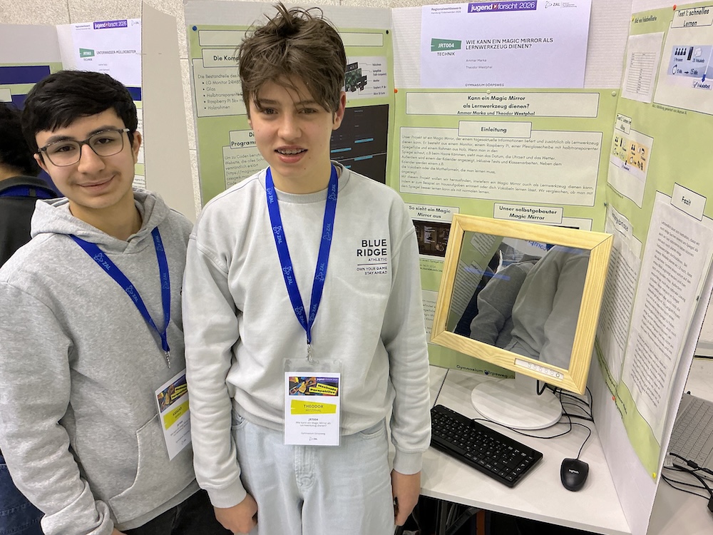 Das Lernen soll zu einer schönen Nebensache werden, jedenfalls wenn es nach Ammar Marka (9c) und Theodor Westphal (9b) geht. Sie haben anhand ihres „Magic Mirrors“ technischen Möglichkeiten geschaffen, sich nebenbei vielfältigste Informationen auf einem Spiegel anzeigen zu lassen, und sich dabei gefragt, ob man damit das Lernen von Vokabeln revolutionieren könnte. Bislang sieht es noch nicht ganz danach aus, aber sie forschen weiter und wurden mit einem Sonderpreis in Form eines Planetariumsbesuchs ausgezeichnet.