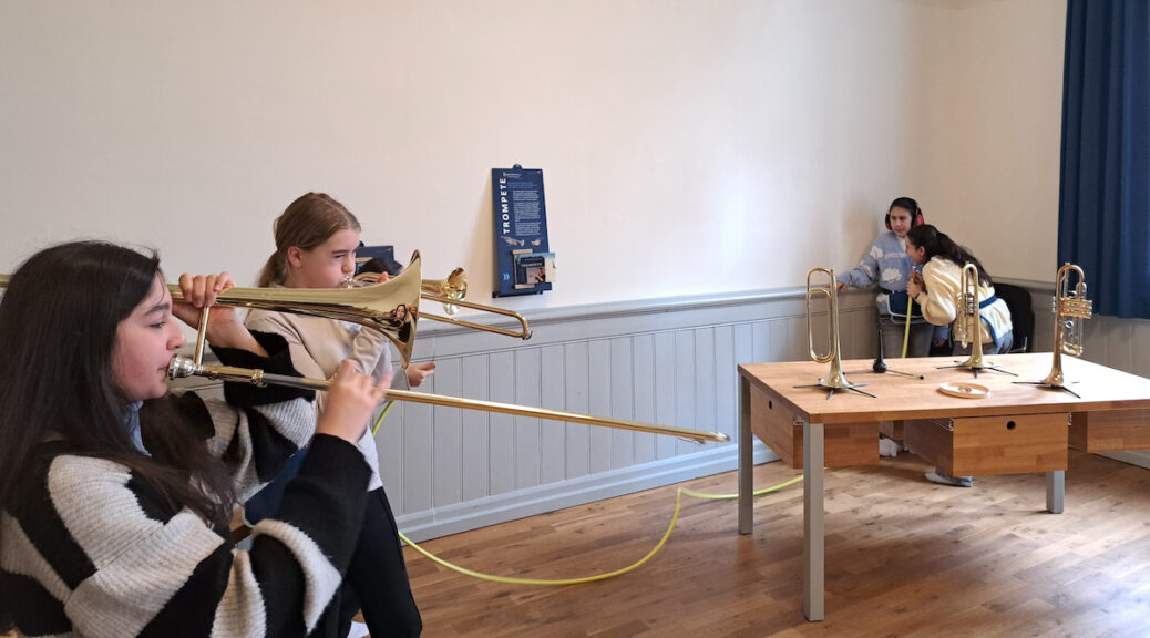 Als wir dort waren, haben wir erfahren, wie man Holz- und Blechblasinstrumente unterscheidet, nämlich nicht nur durch das Material, sondern auch durch die Mundstücke: Holzblasinstrumente haben ein Rohrblatt, beim Blechblasinstrument gibt es eine Anblaskante.