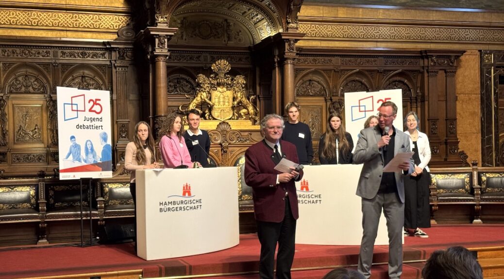 Hitzige Debatten, kontroverse Fragestellungen und spannende Schlagabtausche: Auch im 25. Jubiläumsjahr von Jugend debattiert fand der Hamburger Landeswettbewerb erneut im feierlichen Rahmen des Rathauses statt. Ich selbst hatte das Privileg live am Wettbewerbstag dabei zu sein und konnte deshalb eine ganz besondere Atmosphäre spüren: eine Mischung aus einer energetisch geladenen, knisternden Anspannung der Teilnehmer, die jedoch von einer motivierten und positiven Grundstimmung getragen wurde. Dies ließ sich ebenfalls in den Debatten selbst wiedererkennen, in denen stets ein respektvolles Miteinander gepflegt wurde und ein hohes Maß an Gesprächsfähigkeit herrschte.