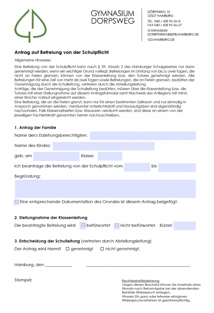 Alle Befreiungen für eine Zeit von mehr als zwei Tagen sowie Befreiungen, die an Ferien grenzen, bedürfen der Genehmigung durch die Schulleitung, vertreten durch die Abteilungsleitung. Für Anträge, die der Genehmigung der Schulleitung bedürfen, füllen Sie bitte dieses Antragsformular aus, fügen einen Nachweis Ihres Anliegens bei und geben diese Unterlagen mit mindestens einer Woche Vorlauf bei den Klassenleitungen bzw. den Tutores ab.